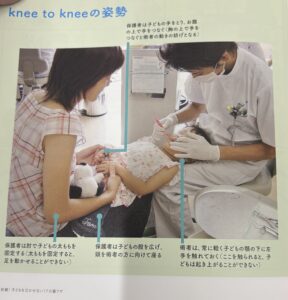 小さいお子さんで一人で座るのが無理なお子さんの場合は、市の1歳半~3歳半の乳幼児検診で行うような膝上診療にて口腔内をチェックします。